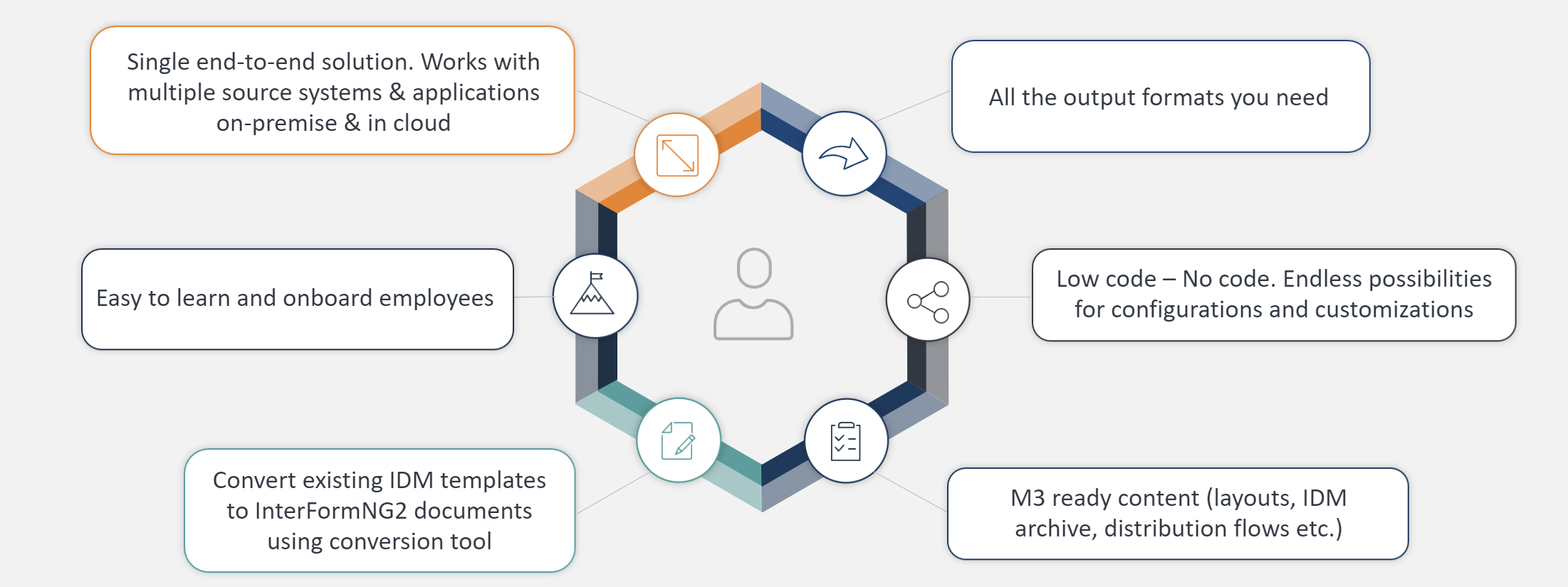 The InterForm M3 Package is a modern output management solution that caters to the unique needs of the company. The solution combines Infor M3, Infor OS, Infor IDM with InterFormNG2, and is the most agile solution in the market for both on-premise and cloud customers. It transforms output management by providing pre-integrated elements, pre-installed layouts, and setups. This ensures an extremely fast and efficient start-up and ongoing operation.
